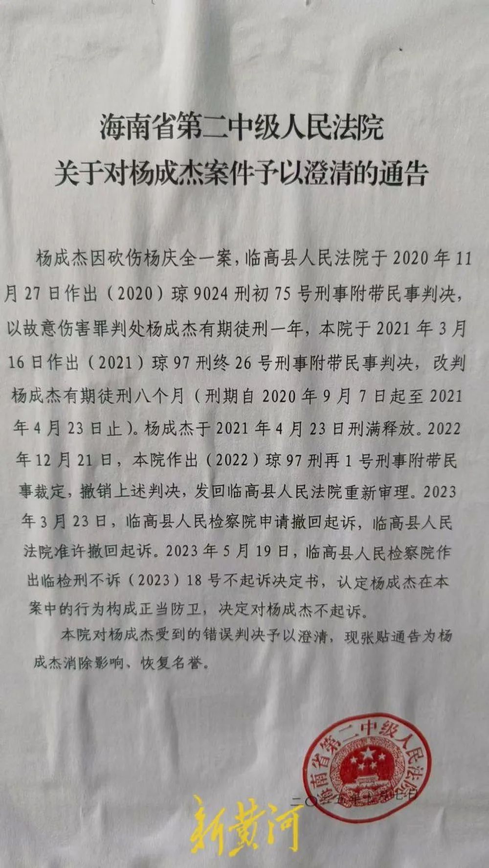 《澄清通告》显示,2023年5月19日,临高县人民检察院作出不起诉决定书,认定杨成杰在本案中的行为构成正当防卫,决定对杨成杰不起诉。本院对杨成杰受到的错误判决予以澄清,现张贴通告为杨成杰消除影响、恢复名誉。记者注意到,《澄清通告》的落款时间为2025年7月7日。