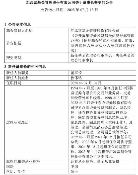 2025年7月14日晚间,汇添富基金一则董事长变更公告引发行业关注——鲁伟铭正式接任公司董事长,原董事长李文因董事会换届离任,转任公司其他岗位。